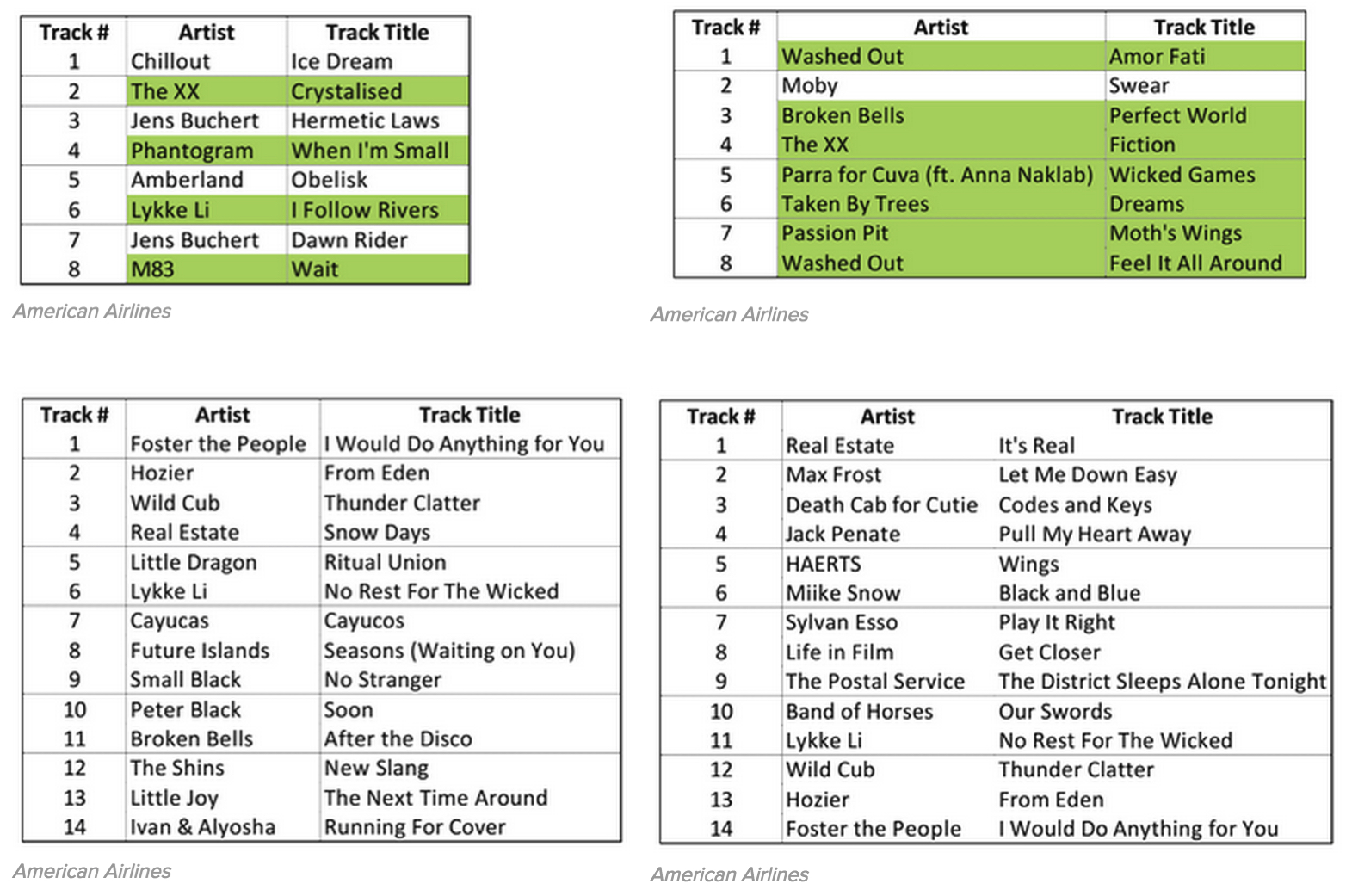 Below are some of the playlists that American Airlines plans to incorporate into their regular flying routine. While they’ve got some music in there that might be pleasant to listen to while dealing with the painstaking process of boarding a plane, most of the tracks might not necessarily qualify as “lesser-known up-and-coming artists”. Hozier? The xx? Lykke Li? M83? Haim? Foster The People? Moby? They don’t really qualify as “lesser-known". What would your picks be for an airline-curated indie playlist?