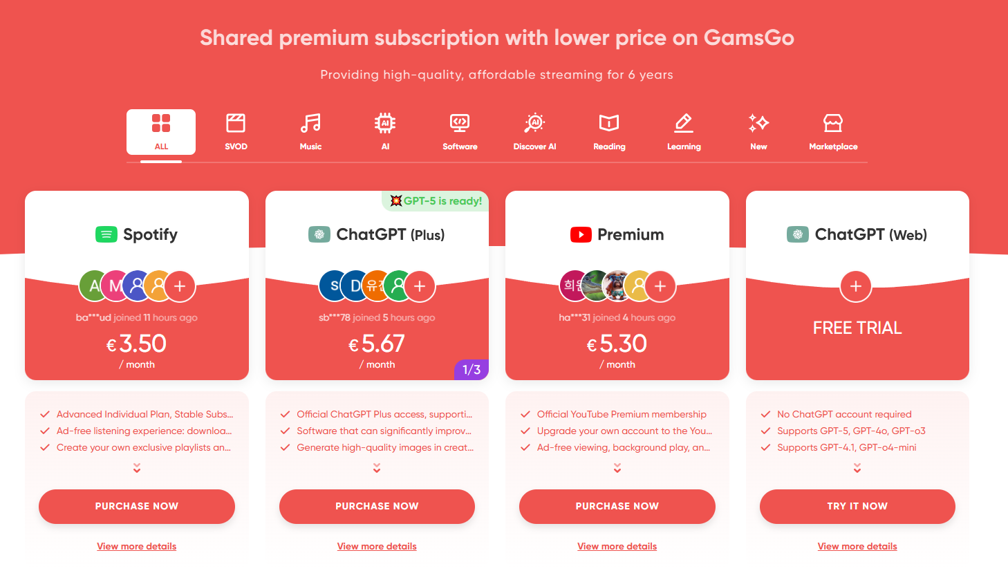 - GamsGo Spotify Premium account: This is the most direct and effective way to save. GamsGo is an account sharing platform where Spotify accounts cost about 30% of the official price. Features are identical to official Premium: ad-free listening, unlimited skips, offline playback, and more. If any issues arise with your account, they’re handled promptly. It offers substantial savings with reliable service.