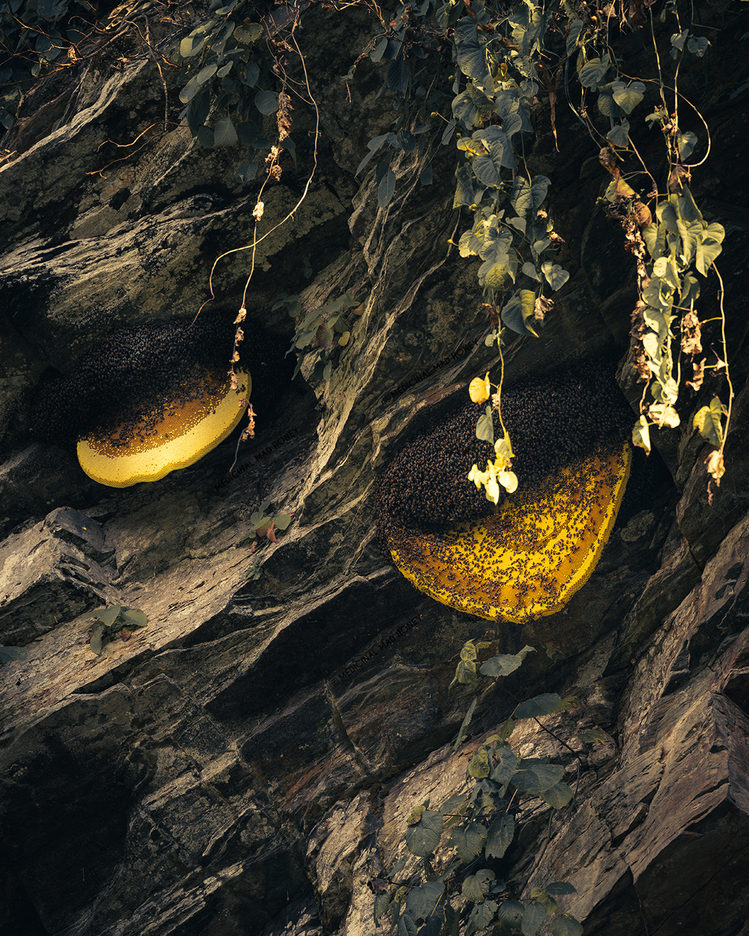 Among ethnic groups of Nepal, Gurung indigenous communities stand as a unique community with honey hunting history. These hunters conduct. Honey hunters conduct their yearly harvests twice during the spring and autumn when they scale steep cliffs using rope ladders along with handmade bamboo poles to collect honeycombs from Apis Laboriosa Himalayan giant honeybees. Because this species exists at heights exceeding 8,000 feet elevation it manufactures red-colored honey known as mad honey or Red Honey.