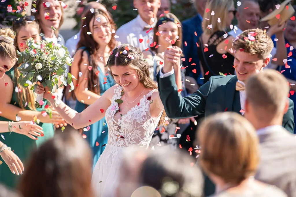Bride and groom exiting ceremony amidst confetti and smiling guests in outdoor setting